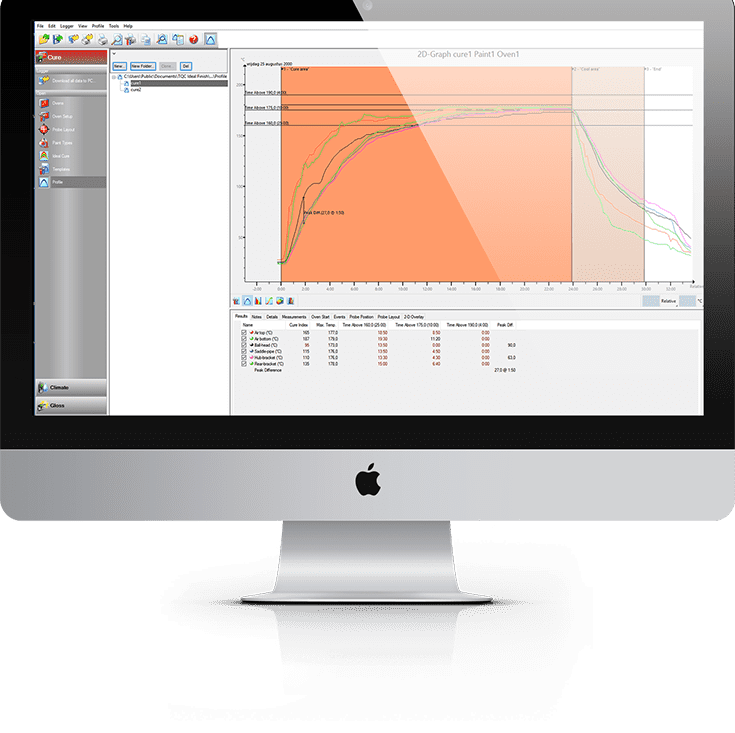 The Ideal Finish Analysis Software is the most advanced coating climate, coating cure and coating thickness monitoring software package available today. With two user levels Ideal Finish Analysis offers user friendly reporting functions for standard production work as well as advanced calculations for in depth analysis of the climate parameters prior to coating, the curing process and oven performance during coating and the thickness after coating.
