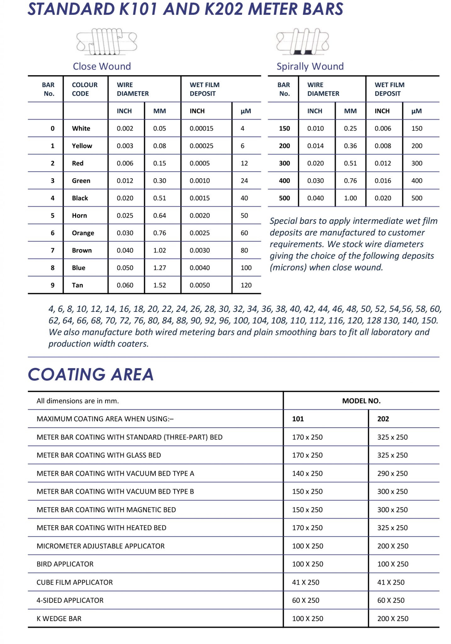 to most substrates. A meter bar is manufactured by winding precisiondrawn stainless steel wire on to a stainless steel rod, resulting in a pattern of identically shaped grooves. These grooves then precisely control the wet film thickness. Close wound bars produce a coating thickness from 4 to 120μm. Higher coating weights up to 500μm can be obtained using spirally wound